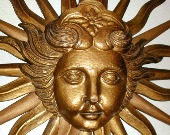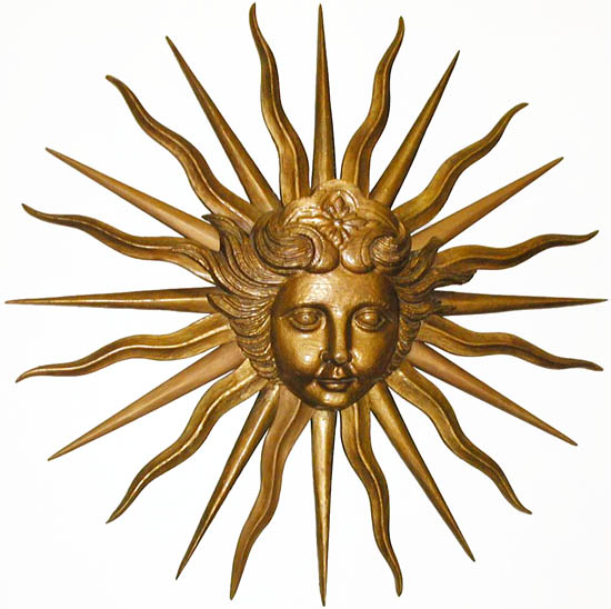 According to the Chateau de Versailles web site, Louis XIV chose the sun for his emblem in part because of the symbolic association of the sun with Apollo, ancient Greek god of Peace and the Arts, and in part because the sun is the center of the universe, regulating the rhythms of daily life. Louis’s identification as the “Sun King” was reinforced by his daily public morning rising and evening retiring ceremonies. He had the décor of Versailles filled with depictions and attributes of Apollo — laurels, a lyre, a tripod and a face surrounded by the rays of the sun.