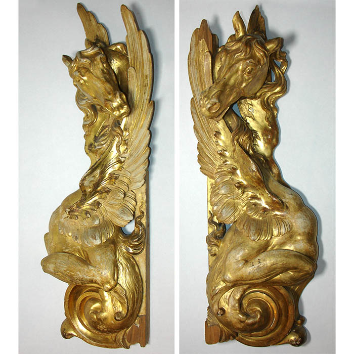 A pair of giltwood wall plaques in the Italianate Baroque taste, each of a stylized winged Pegasus horse in a scrolled design. They are finely carved, with opposing elements — one horse facing right the other facing left. Each is executed in sculptural relief with a realistic horse head with flowing mane tilted as if peering over its wing. They were likely originally incorporated as architectural elements in interior paneling.