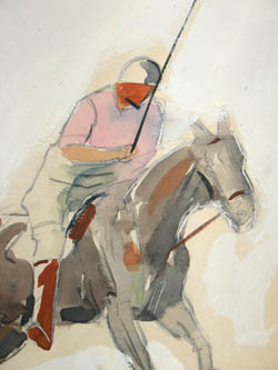 Stylized watercolor of two polo players by the Cleveland artist John Lorin Black. Apparently a preliminary sketch for a larger painting, the work is fluidly painted with gestural brushmarks conveying the motion of the horses.