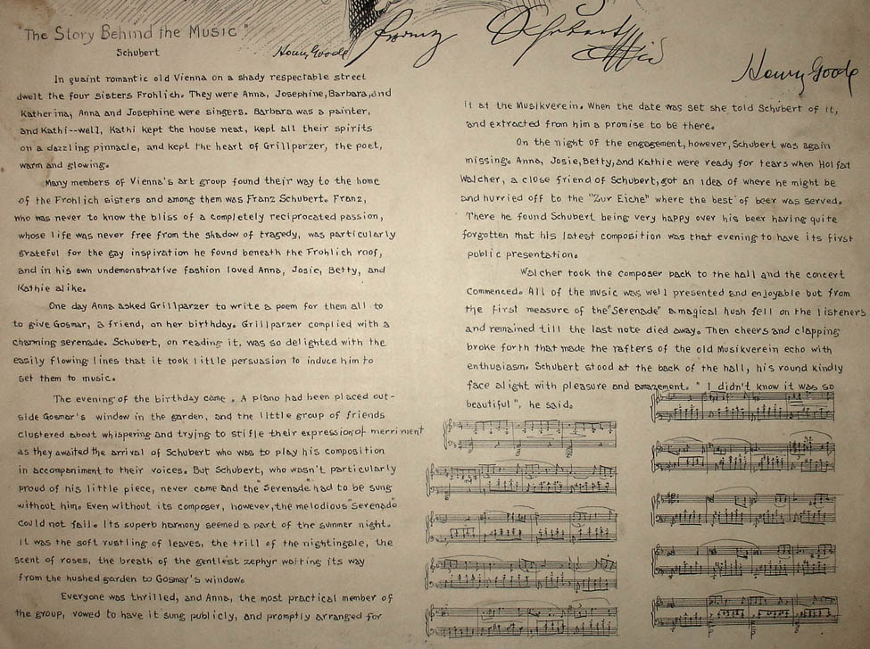 Franz Schubert’s portrait is based on a famous painting by Wilhelm August Rieder, now in the Wien Museum in Vienna, Austria (see References below). The story, which is accepted by scholars as having actually occurred, concerns his Serenade — officially known as Ständchen (D291) — a poem by Franz Grillparzer he set to music at the urging of his friends, the four Frohlich sisters, whose portraits Goode has placed in the background. His friends valued the result more highly than Schubert did until they convinced him go to a public performance of it they had arranged, to which he responded, “I didn’t know it was so beautiful.”