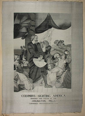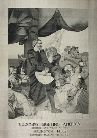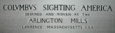 Title beneath image: “Columbus Sighting America. Designed and Woven at the Arlington Mills, Lawrence, Massachusetts, U.S.A.”