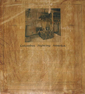 Unusual and large textile woven after a historical painting of Christopher Columbus. It shows Columbus seeing the New World for the first time during his historic voyage of 1492. A tour de force of Jacquard weaving, it was produced to commemorate the 400th anniversary of Columbus’ voyage and also to demonstrate the capacity of the maker, Arlington Mills, to tackle complex designs. The image comes from a painting by the German artist Hermann Freihold Plüddemann now in the collection of the National Gallery of Berlin. It shows a heroic Columbus standing on the deck holding a rolled navigational chart and looking thoughtfully into the distance while members of his crew are overcome with excitement and relief at the news that land has been sighted in the distance.