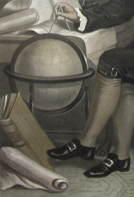 Full-length portrait engraving of Benjamin Franklin made from a painting done long after his death by a popular painter of historical subjects. Franklin sits at a desk before a bookcase, with a couple of massive volumes on the floor. He is surrounded by apparent allusions to his career: the quill pen shows that he is a writer, a map and a globe relate to his diplomatic career, the pair of glasses held in his left hand is a reminder of his invention of bifocals, and the lightning storm raging beyond the window suggests his famous electricity experiment. The print is inscribed: “Benjamin Franklin/ Born in Boston Jan. 17th 1706. Died in Philadelphia, April 17th 1790.” The artist and engraver are identified in the lower margin. This engraving is framed in a gilt frame with black panel.