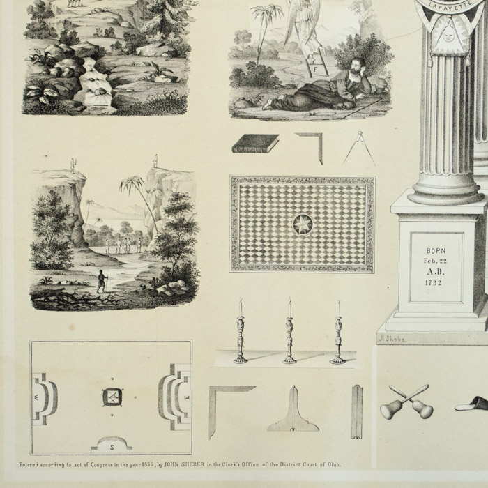 John Sherer was a lithographer and publisher based in Cincinnati, Ohio, from 1847 to at least 1859. In 1847, he was in a partnership as Sherer & Rowse. From 1849 on he was in business under his own name or as Sherer Publications. Sherer’s specialty became Masonic-themed prints but he also sold regalia and other supplies to lodges. He became well-known for his Masonic Carpet, a set of charts mounted on muslin or canvas to be hung in Masonic lodges. They showed the symbols and emblems associated with different lessons presented to aspiring Masons and were referred to during lectures to members. The visual representations of Masonic symbols were intended to serve as reminders of these lessons. He also published the books Sherer’s Gems of Masonry (1859), The Masonic Ladder (1866) and Sherer’s Masonic Monitor (1867). The images used in Sherer’s publications later were adapted to lecture slides and videos that are still in use in Masonic lodges today.