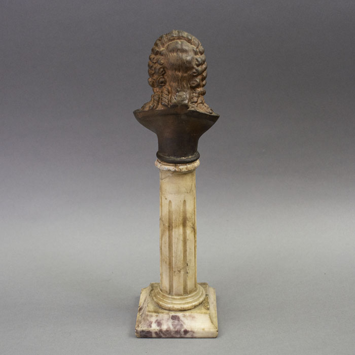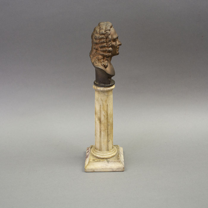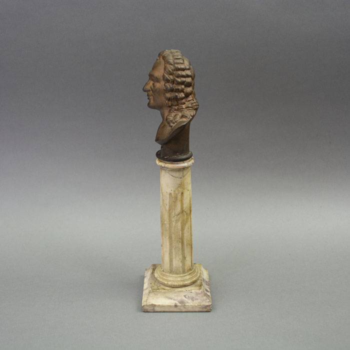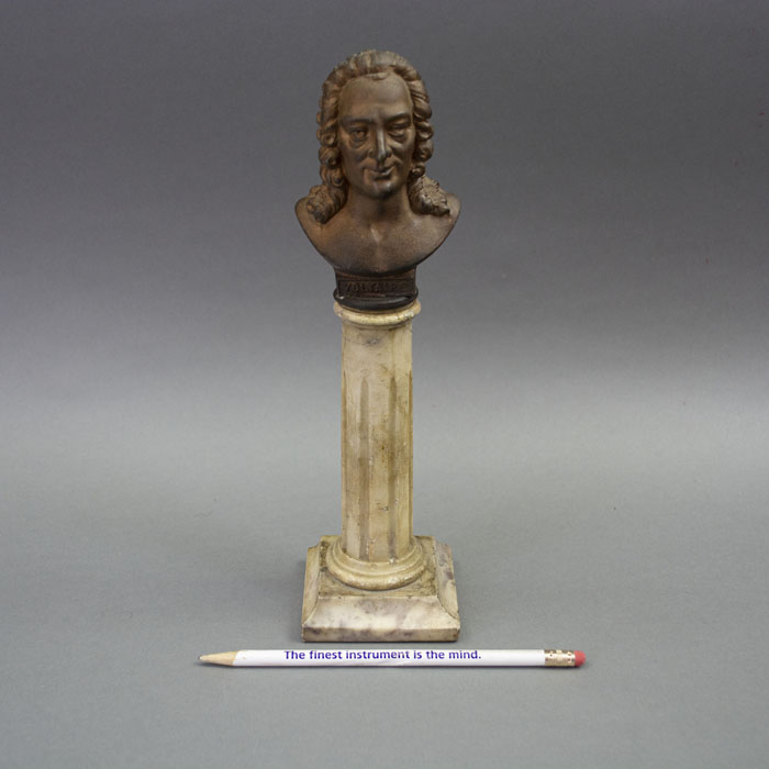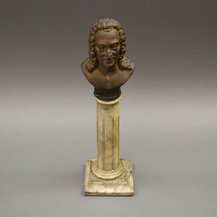 A miniature bust of the acclaimed French 18th century philosopher, Francois-Marie Arouet, known by his nom de plume M. de Voltaire. The bust in cast metal with traces of gilding is shown with head and shoulders, with Voltaire wearing a long wig and facing forward, and the name VOLTAIRE incised on a socle, all raised on a fluted classical marble column with square base. Voltaire wrote numerous plays, poems and essays. His most famous and notable works include Lettres Philosophiques (1734) and Candide (1759). The former is considered to be his masterpiece and one of the greatest achievements in Western literature. This charming small rendition of the prolific philosopher would make a handsome display on a shelf or desk as an office or library accoutrement.