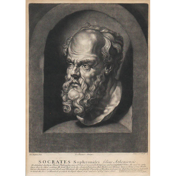Socrates: “P.P. Rubens Del. Ex Marmore Antiquo. J. Faber sen’r Fecit. He delighted chiefly in Moral Philosophy, was a Person of irresistible Eloquence and accomplish’d Virtue, He said that he only knew that he knew nothing, He held Rest to be the choicest Possession, that Riches and Honour have nothing of true Worth, but are the Source of various Evils and Mischiefs, He derided the Plurality of Heathen Gods, and for that Account was condemn’d to drink the Juice of Hemlock of which he Dyed. Aged 76 yrs. and abo’t. 428 yrs. before Christ. Printed for & Sold by Thos. Bowles next the Chapter House in St. Pauls Ch. Yard.”
