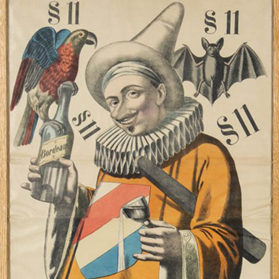 The poster is imprinted in the lower right “CBN W” thereby crediting the publishing house C. Burckardt Nachfolger of Wissembourg,which was the successor company to the Wentzel family of publishers, also of Wissembourg. Among the works published by the firm were a series of posters in the tall, narrow format of the offered poster of Pierrot. Each is of an individual colorful and whimsical character — most likely based on local theatrical performances. Another poster in this series — a witch — also features various mystical animals including an owl, snake, crab, turtle and snail with the main subject portrayed in a similar manner to Pierrot. Other extant prints in this format by Burkhardt include various jesters, clowns and kings; Mephistopheles; a fiddler, a trombonist and a minstrel banjo musician; and an elderly man dressed as a fop. The artistic design of the posters has often been credited to the Wentzel family publishing firm, the predecessor of the Burckhardt firm.
