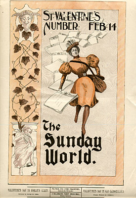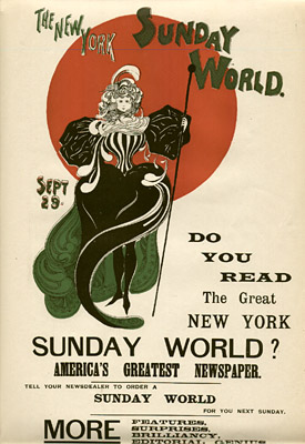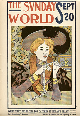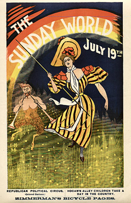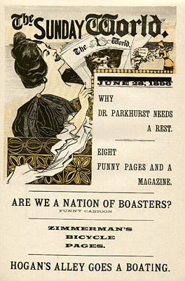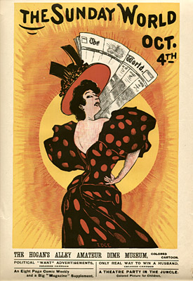 The Sunday World figures prominently in the history of the comics, with two major innovations. In 1889, under Pulitzer’s direction, it launched the first Sunday comics section, which proved an immediate success and circulation builder. In 1895, the paper debuted the first color comic strip, an episode in the series The Yellow Kid, by the innovative cartoonist Richard Felton Outcault (1863-1928). The following year, rival publisher William Randolph Hearst lured Outcault away by offering him more money. Pulitzer countered by hiring George Luks to continue the Yellow Kid series, and a legal battle ensued. The judge ruled that Outcault could draw what he wished, but the Sunday World retained the rights to the original name of the setting, “Hogan’s Alley,” and continued to publish and advertise its rival strip.