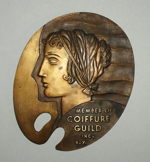 The plaque was evidently intended for display by members of the Coiffure Guild of New York, a trade organization of hairstylists and hairdressers. The Guild members contributed to style trends and publically commented on the latest hair styles of the era, including references to celebrities. For example, as reported in the St. Petersburg Times, December 28, 1935, the Coiffure Guild made an annual list of the ten best coiffured women in the country. In that year the Number 1 selection was Bette Davis; other actresses and socialites were also included on the list that year including Katherine Hepburn, and Countess von Haugwitz-Reventlow (heiress Barbara Hutton in her second marriage).