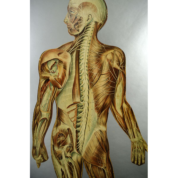 A double-sided anatomical manikin, one side showing half skeleton/half veins, and the other side showing musculature. Formerly part of a set with attachable metal organs (lacking). Displays on stand (as shown) or in original box (not shown).