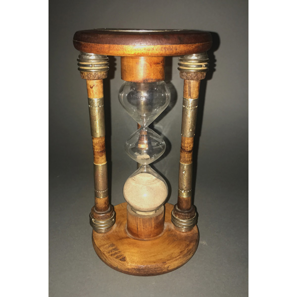 The invention of the hourglass is attributed to an 8th-century monk in Chartres, France, with the marine sandglass appearing as early as the 14th century. In earlier examples the bulbs were connected with a material such as putty or a hardened wax, bound in leather, linen or string. From about 1720, the two bulbs were welded together over a brass bead drilled with a hole, often still bound in leather. From around 1760, the glass was blown in one piece (with the sand inserted in the cooled end before sealing it). Ships would use the glasses to measure time at sea on a given navigational course. The invention of clocks and watches largely superseded the practical need for hourglasses.