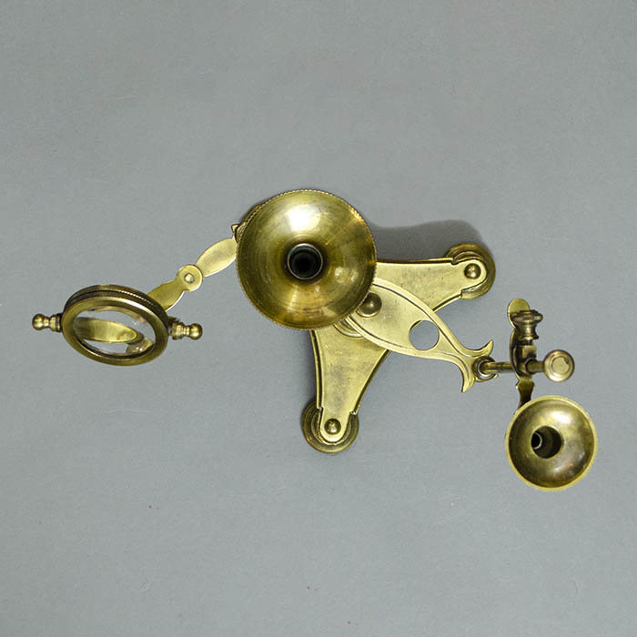 Microscope condensers on stands are an external accessory for use with microscopes, generally with a convex lens to concentrate light. Inasmuch as they distort the image when used with the naked eye, they do not serve well as magnifiers. Microscopes and their condensers are usually made of brass, in a rich yellow lacquer finish. The basic form is a round base with a vertical stem, holding an adjustable lens on another stem. Magnifying glasses mimicking this form are also commonly encountered, but unlike the condensers have a magnifying lens, rather than a concave lens to concentrate light.