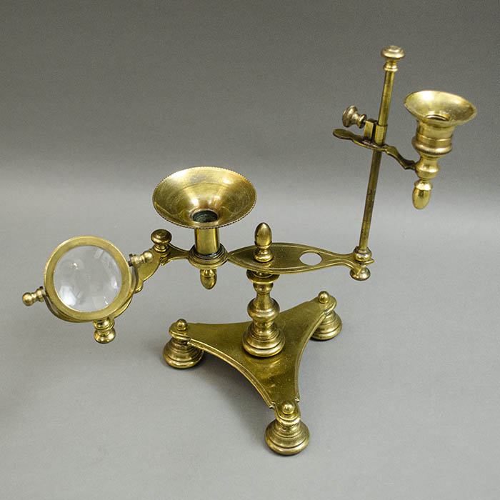 Magnifiers and lenses on stands are constructed to be hands-free and steady when in use. Frequently made of brass, the stands are often adjustable vertically and horizontally as well as at various angles. Many adjustable stands work on the principle of sliding rods (stems) that can be moved or rotated by loosening and tightening a thumb or set screw (bolt). Others have a ball and socket joint to move in a variety of directions. Laboratory and other utilitarian magnifiers are often comprised of an adjustable arm (stiff or gooseneck) set on a weighted iron base. They frequently exhibit an Art Deco, Modernist, or Machine Age style. Slightly more complex lenses on stands include those with a built-in oil lamp or candle socket for illumination of the object being magnified.