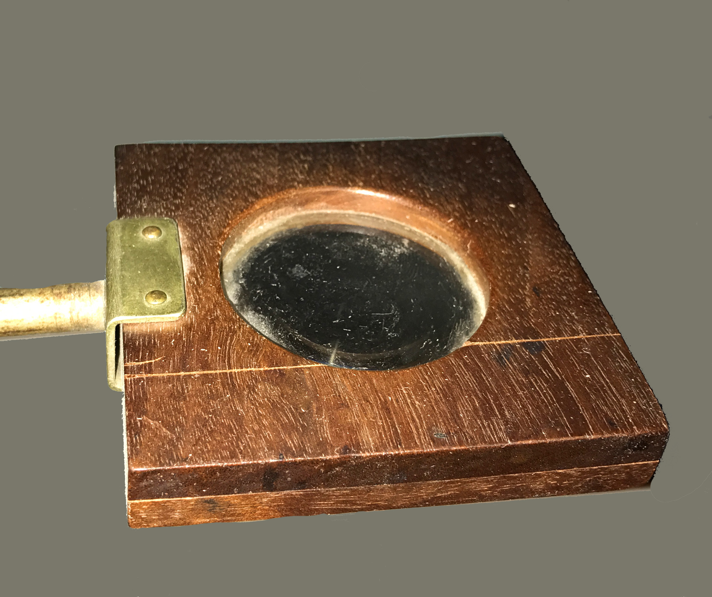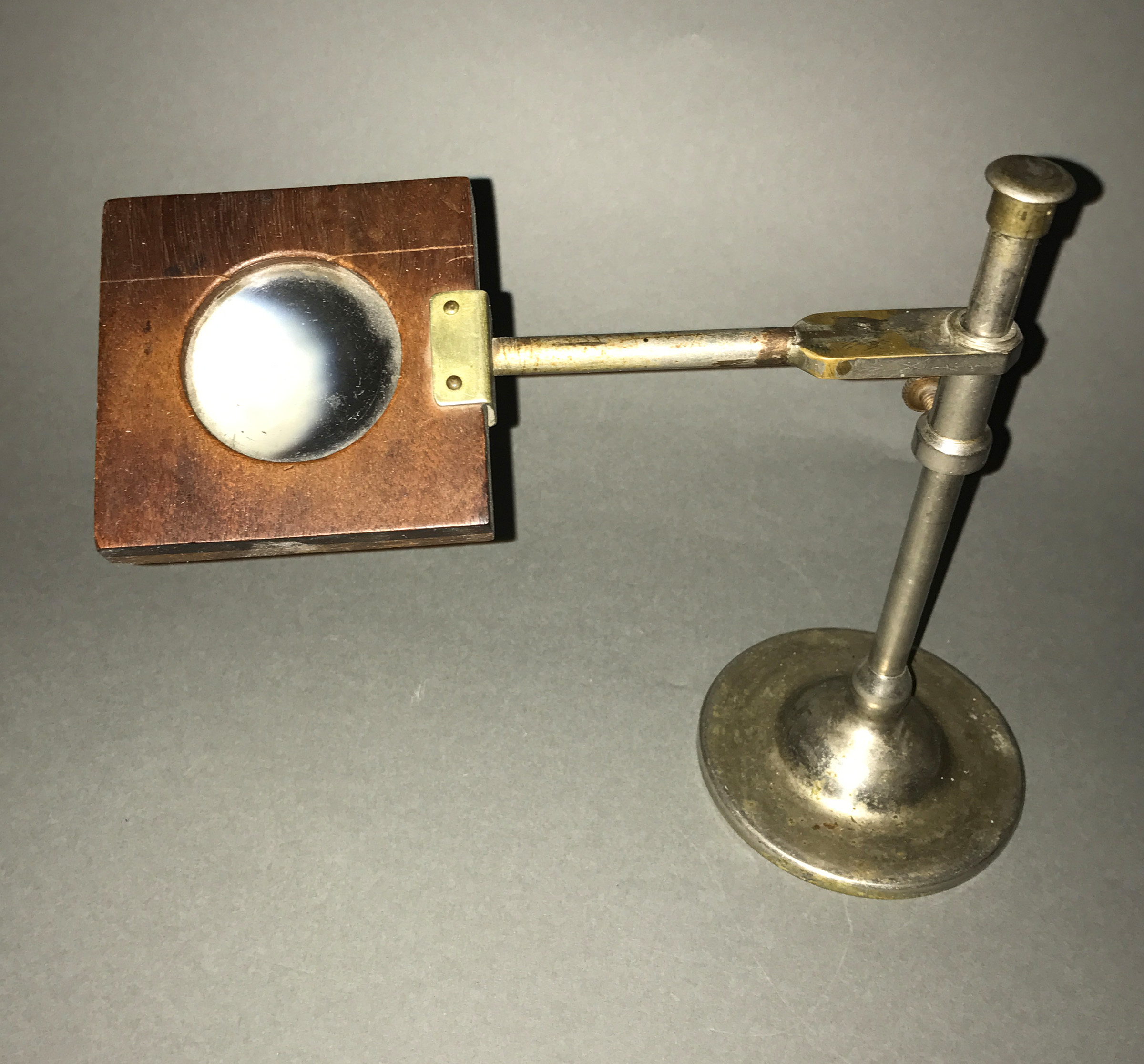 Magnifiers and lenses on stands are constructed to be hands-free and steady when in use. Frequently made of brass, the stands are often adjustable vertically and horizontally as well as at various angles. Many adjustable stands work on the principle of sliding rods (stems) that can be moved or rotated by loosening and tightening a thumb or set screw (bolt). Others have a ball and socket joint to move in a variety of directions. Laboratory and other utilitarian magnifiers are often comprised of an adjustable arm (stiff or gooseneck) set on a weighted iron base. They frequently exhibit an Art Deco, Modernist, or Machine Age style. Slightly more complex lenses on stands include those with a built-in oil lamp or candle socket for illumination of the object being magnified.