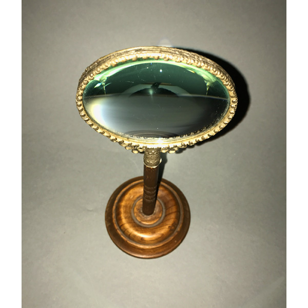 Magnifying lenses on stands are instruments for jewelers, engravers, collectors of coins or stamps, scientists, and others who need to inspect or work with tiny objects without having to hold a magnifying glass in one hand. They can also be used magnify words or images that are too small to otherwise read or discern. We also offer magnifying glasses with a handle, of typical form, to be hand held for magnification purposes. Please contact us concerning our current inventory.