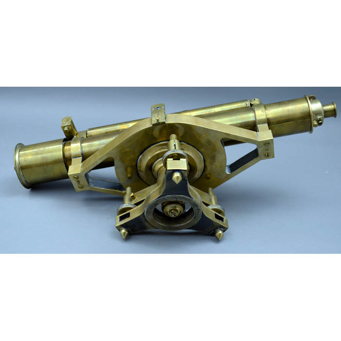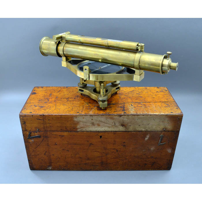 Antique English surveying instrument in its original wood storage box, made by England’s leading maker of fine surveying and drawing instruments at that time, William Ford Stanley. The 19.5-inch telescope has a bubble level and a tripod base with adjustable feet. The box has a label certifying that it had been adjusted on December 12, 1913.
