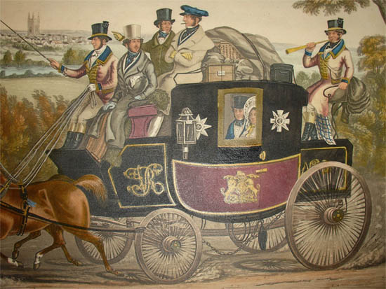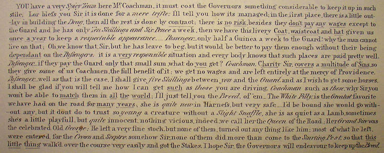 The passenger begins by observing, “You have a very Spicy Team here Mr. Coachman, it must cost the Governors something considerable to keep it up in such stile.” The coachman proceeds to explain that in fact the governors manage the operation with very little investment or outlay of cash, and though he’d prefer to receive regular wages, “they don’t pay any wages except to the Guard and he has only Ten Shillings and Six Pence a week.” Coachmen, aside from being provided with a new livery coat, waistcoat and hat once a year “to keep a respectable appearance,” survive off of “Charity” (presumably tips from passengers). The passenger, startled to hear that even the Guard does not earn a living wage, replies that he will give “five Shillings between you and the Guard” and asks the coachman’s advice concerning how to acquire good horses. The coachman goes on at length with a colloquial monologue concerning each horse in the team and its breeding history. Arriving at his destination, the passenger tips the coachman five shillings as promised and adds, “I have been much amused, and shall not forget the Birth Day Team and the Quick-silver Mail.”