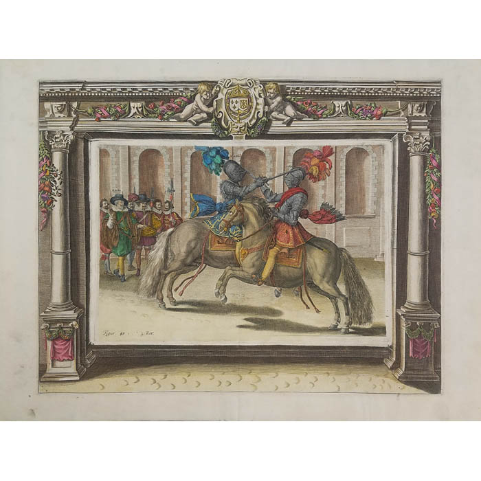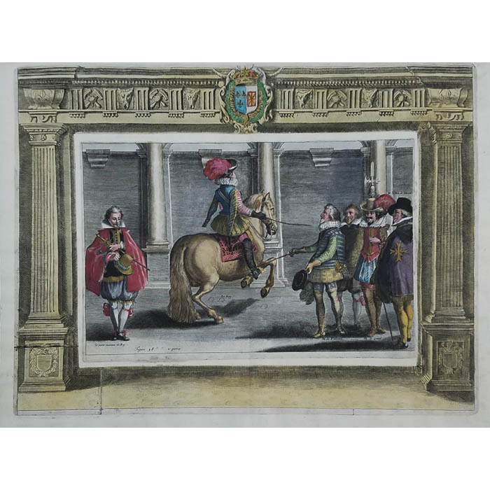 Antoine de Pluvinel was born in France and taken to Italy to study horsemanship from the age of 10 to about 16, when he was taken in by M. de Sourdis, the premier ecuyer (first equerry) of King Charles IX. In his early 20s, Pluvinel was appointed first equerry to the king’s brother, who soon succeeded to the throne as Henri III. His reputation grew, and when Henri IV took the throne in 1589, Pluvinel remained as a member of the court. In 1594, Pluvinel realized his dream of founding a riding school. He was at work on his book Le Manege Royal when he died. A first, incomplete edition appeared in 1623, illustrated by Crispijn de Passe. A second version, illustrated by the same artist, with improved text was issued about two years later under the title L’Instruction du Roy, en L’Exercice de Monter a Cheval and this version was translated and reissued many times. The book shows the instruction of the young Louis XIII (1601-43) who was crowned in 1610 under the regency of his mother and reigned from 1617 onward. The text and illustrations explain Pluvinel’s principles of training horses in the form of a dialogue with the king, interspersed with commentaries by M. le Grand and other distinguished authorities. Pluvinel’s book was groundbreaking in its advocacy of humane training methods, a departure from the harsher practices commonplace at the time.