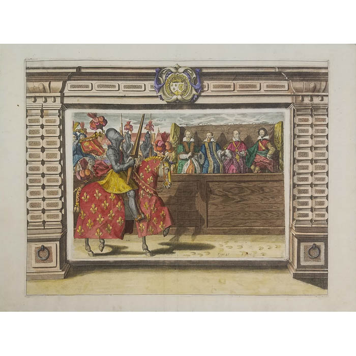 King Louis XIII dressed in red, parades on horseback, carrying a lance, past a wooden viewing stand where four distinguished men are seated: Mr. le Chanselier, Mr. le Pr. President, Mr. de Shasseau Neuf., and Mr. de la Villaueler Pl Socn. D’Estas.