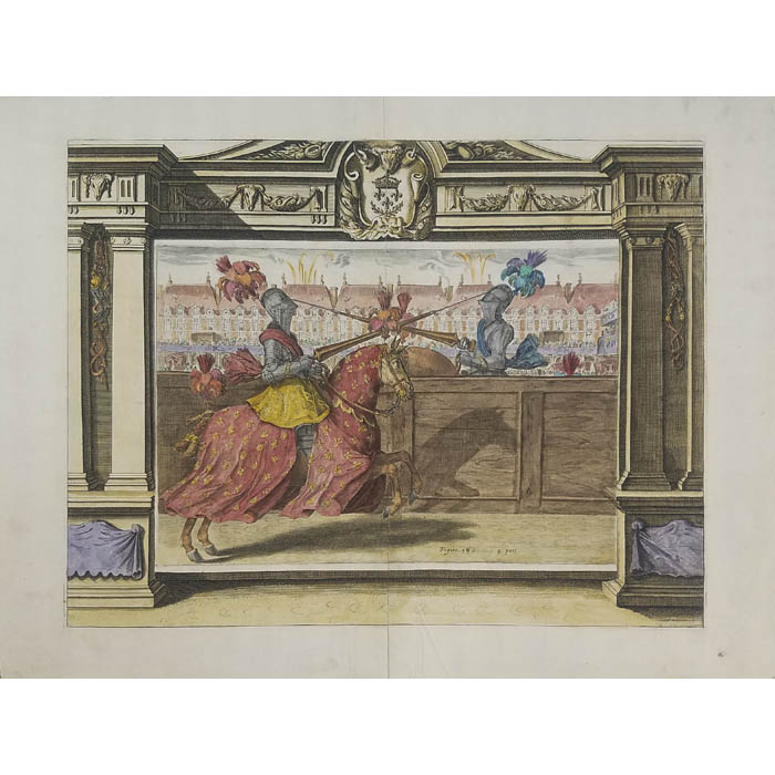 King Louis XIII (Le Roy), in red, demonstrates a sword fight on horseback with M. de Pluvinel, in blue. M. de Sau and five other men watch.