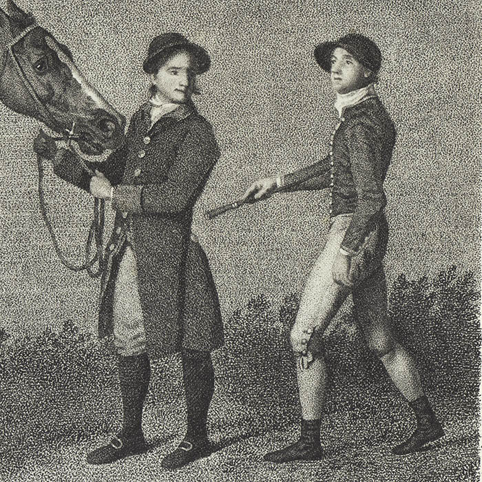 This setting is perhaps intended to convey an episode during preparation for Eclipse’s closest race, against Mr Wentworth’s Bucephalus, which was the last race in which Eclipse was ridden for Wildman before O’Kelly bought him outright. According to Stubbs’s Review of the Turf proposals, the jockey portrayed is ‘Samuel Merrit, who generally rode him.’ Whyte, however, maintains that ‘Fitzpatrick and Oakley rode him in almost all his races.’ (Lennox-Boyd, 130)