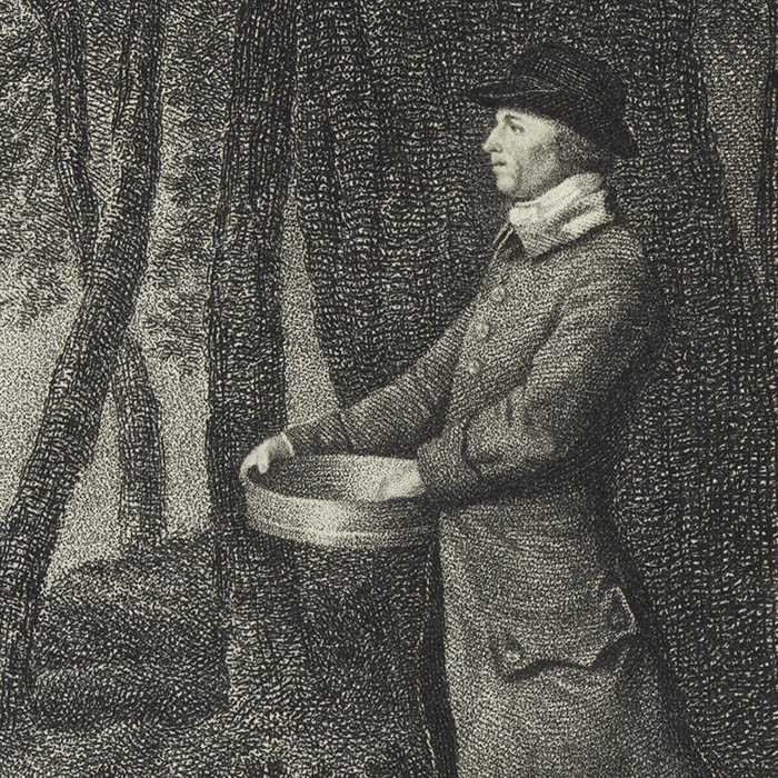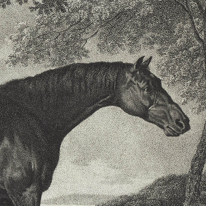 George Stubbs (1724-1806) was one of the greatest sporting artists of Georgian England. He combined science and art by painting animals with anatomical precision. After a visit to Rome and a period of residence in Liverpool, he returned to England in 1760. He also drew horses based on dissections, and in 1766 published a monumental series of engravings, Anatomy of the Horse, which cemented his reputation as a master of the subject. His vast body of work includes paintings of the prize horses of England of the late 18th century, often with their proud owners or trainers. He also painted hunting scenes, and wild animals such as lions and tigers, including some with lions stalking horses. Stubbs served as president of the Society of Artists in 1773 and though he had his quarrels with the Royal Academy, he exhibited there periodically and was elected as an Associate in 1780. Many of his paintings are in the world’s major museums, with a large number represented in the Yale Center for British Art (Paul Mellon Collection). Some of the greatest engravers and printers of the day were engaged to render Stubbs’ animal pictures as prints, including William Woollett (1735-1785), and Stubbs’ son, the printmaker George Townly Stubbs (1756-1815) (sometimes spelled “Townley”).