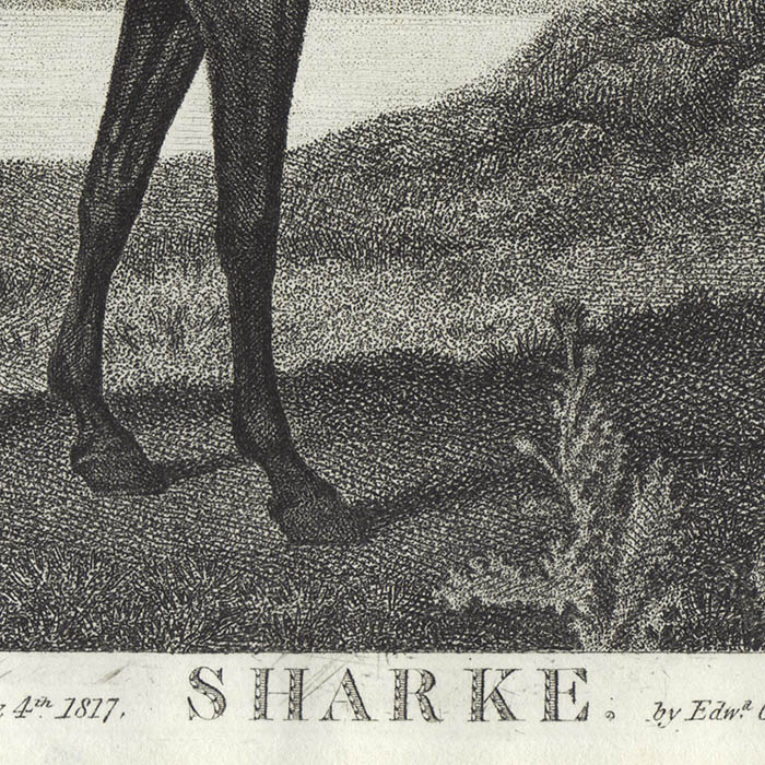 Inscription below Sharke: “Sharke. George Stubbs pinx’t. Geo. Townly Stubbs sculp’t. Engraver to his R.H. the Prince of Wales. London, Republished June 4th 1817, by Edw’d Orme, Bond Street.”