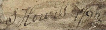 We have rematted and reset the prints in their frames. The titles were on handwritten cards accompanying each print. These cards may have been mounted to earlier frames or cut from the original mats. There were also indications on the paper backing of the frames that they were once part of a set of six. A pair of Howitt watercolors of hunters pursuing and capturing a hare sold at Sotheby’s in 2004 may have been associated with the four shown here. Their size and materials are the same, and they have similar landscape settings, compositions and color schemes. Like some of the four paintings shown here, both were signed “Howitt” and one was also dated 1792. (See References below).