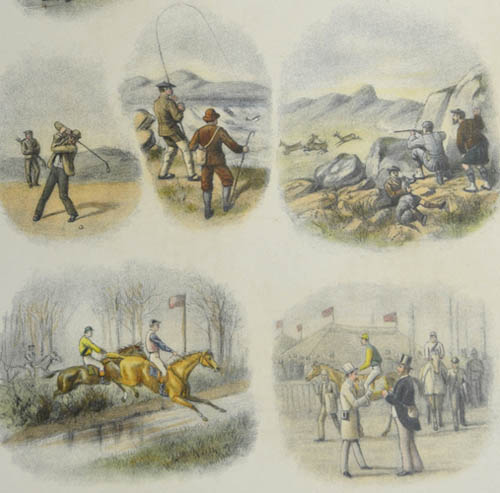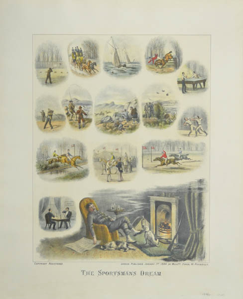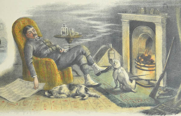 Makes an admirable companion to either of the above [The Sporting Cantab or The Oxford Undergrad], and shows us a tired Sportsman sleeping in his easy-chair before a comfortable fire, and dreaming of the various Sports, which are cleverly depicted in the wreaths arising from his half-smoked pipe.