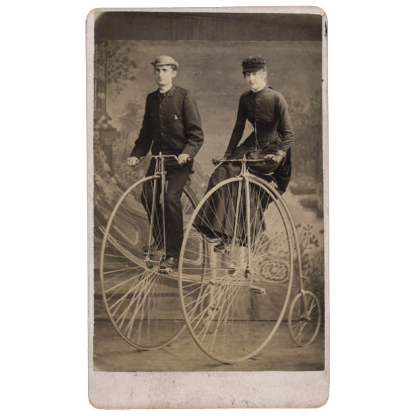 Studio photograph portrait of a man and woman each posed in formal dress on a large Penny Farthing bicycle, with studio landscape in background. It is in the standard size and format of a carte de visite (CDV), a type of small photograph mounted on card, typically containing a portrait, frequently collected in albums.