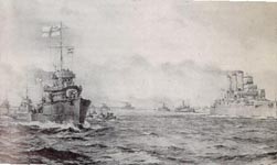 The HMS Vindictive was a famous British World War I war ship, involved in a daring raid on a submarine base the Germans had established on the Bruges Canal in the Belgian city of Zeebrugge on April 23, 1918. Although many British lives were lost during the battle, the event dealt a decisive blow to the dreaded German U-boat fleet, and dramatically raised morale in both Britain and Belgium. When the Vindictive returned to England following the raid, the commander, Admiral Keyes, was hailed as a hero. In his memoirs, Lloyd George, the Prime Minster during World War I, wrote: “Every child knows the story of Zeebrugge, the one Naval exploit of the war that moved and still moves the imagination of the Nation.” Winston Churchill referred to the raid as “an episode unsurpassed in the history of the Royal Navy.” The print shown above left depicts the Vindictive at sea with a flotilla of other battleships.