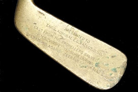 “After the War [the Vindictive] was raised and for a while was a tourist attraction tied up against the quay in Ostende (see photograph above right). Eventually she was cut up for scrap and this must have been when the souvenirs were made. I have heard of a chair and a small picture frame made out of her wooden decking, and I know where her wheel is. The bows of Vindictive were saved and form the centrepiece of a memorial park on the middle of Ostende.”