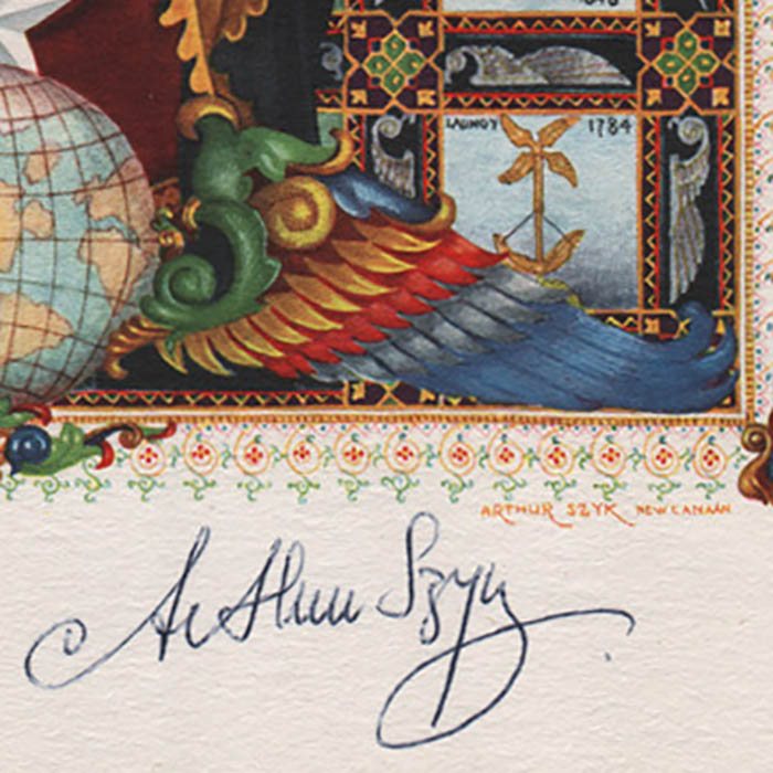 When Germany invaded Poland in 1939, Szyk began producing anti-fascist satirical works, which he toured in North America at the suggestion of the Polish and British governments to raise awareness of the growing threat of Nazism. In the Forties, he emigrated to the United States and became a successful illustrator in his adopted country, doing covers for magazines such as Time, Esquire and Collier’s and advertisements for U.S. Steel and Coca Cola, as well as continuing to produced illuminated books. He worked tirelessly for the establishment of a Jewish state in Palestine. He became an American citizen in 1948, but was investigated in 1951 by the House Un-American Activities Committee for potential Communist activities. Although prominent citizens asserted that this was specious, the stress took its toll, and he died of a heart attack later that year. The Arthur Szyk Society was established in California in 1991 to document and promote his legacy as an artist and champion of democratic and Jewish values