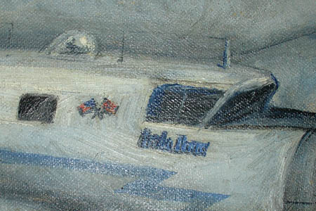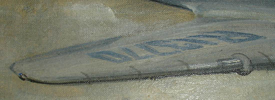 In the composition, Lady Peace is shown flying above white cumulus clouds and casting a small shadow on them. Thus the painting combines two characteristics that the artist, Eric Sloane, is particularly well known for — aviation and interesting, colorful cloud formations. Sloane did the painting about the time of the flight, in 1936, and Dick Merrill later presented it as a gift to his fellow early aviation pilot Bill Waller in 1977. In doing so Merrill inscribed the painting on the verso to Waller as “one of the all time great pilots.” Merrill also signed the front of the painting with his own name, dated 1977, and added the name of Harry Richman in facsimile — all above Eric Sloane’s original artist signature.