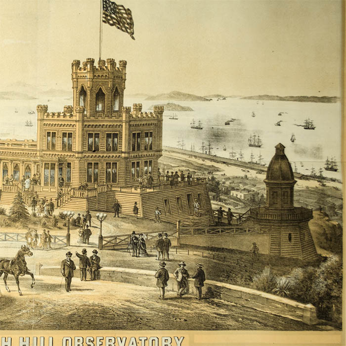 The Telegraph Hill Observatory was in essence California’s first amusement park. Built in the style of a German baronial castle by Frederick O. Layman as a tourist attraction, it took advantage of the site’s panoramic view of San Francisco and the entire bay. The Observatory opened on July 4th, 1882, and within two years, a new cable car line conveyed visitors to enjoy the view, eat at its bars and restaurants, and watch concerts, theatrical performances and an assortment of sporting events from broadsword contests on horseback held in front of the castle to wrestling matches on the indoor stage. Not everyone was enamored; some San Franciscans considered it a monstrosity and dubbed it “Layman’s Folly.” After a disastrous fire, the castle was demolished in 1903. The site where it once stood is now the north parking lot of Coit Tower, constructed in 1933. The tower has proved a more durable addition to the city skyline and its observation deck is a popular attraction.