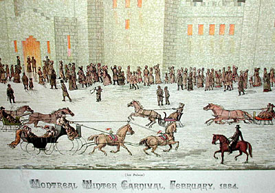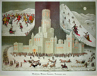 The Montreal Winter Carnival was instituted in 1883 to promote tourism, and was Canada’s first large winter celebration. It became the high point of the winter season, with competitive sporting events held throughout the city. The carnival’s centerpiece was the Ice Palace, constructed from blocks of ice cut from the St. Lawrence River and lit by electric lamps each evening. At the end of Carnival week the Palace was stormed by snowshoers with torches and fireworks.