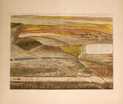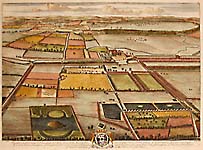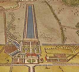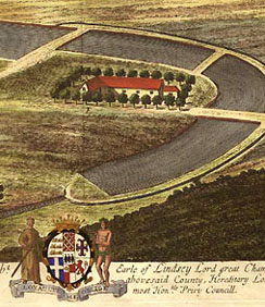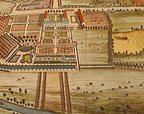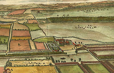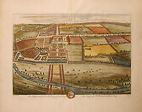 Leonard Knyff was a Dutch artist living in England, as was Johannes Kip, who was also an engraver and print dealer. According to the Grove Dictionary of Art, “The work for which Kip is best remembered is his large corpus of topographical engravings of country mansions, which were published first in 1708. This book is among the most important English topographical publications of the 18th century. The subjects were engraved by Kip after ‘bird’s-eye’ drawings executed by Leonard Knyff.”