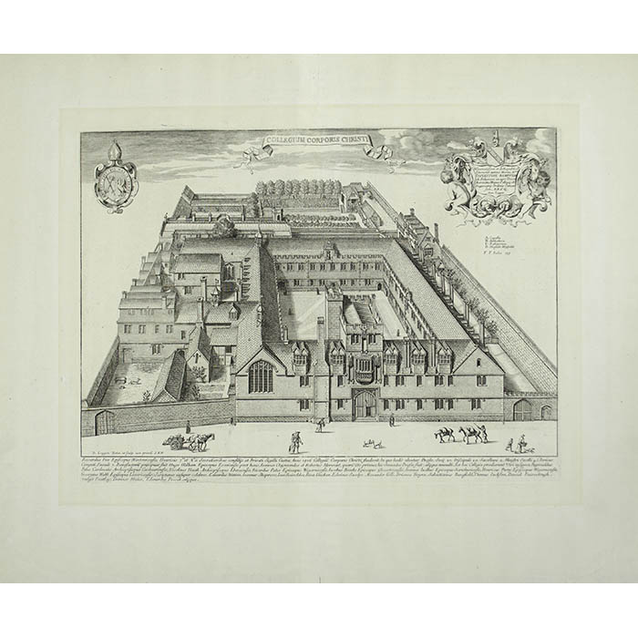 In the view of Corpus Christi, the college shield is depicted upper left. Within an elaborate cartouche, upper right, the engraving is dedicated to Sir Coplestone Bampfylde, 2nd Baronet of Poltimore in Devon, who had studied at Corpus Christi. A lettered key beneath the cartouche notes the locations of the chapel, library, refectory, and “Praesidis Hospitiu.” As the Latin caption notes, the college was founded in 1515-16 by Richard Fox (sometimes spelled Foxe) (1448-1528), a Roman Catholic clergyman who served as Bishop of Winchester (1501-1528) and Lord Privy Seal (1487-1516) among other positions during the reigns of Henry VII and Henry VIII. Fox instituted a curriculum in theology that emphasized study of Greek and Latin sources, which introduced Renaissance ideas to Oxford.