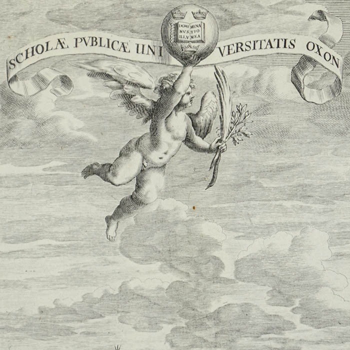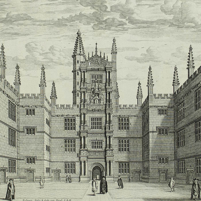 The Schools Quadrangle, completed in 1624, was initiated by Oxford benefactor Sir Thomas Bodley (1545-1613), who had donated the funds to refurbish and expand the university’s library, which became known as the Bodleian Library. The quadrangle buildings were designed to house lecture and examination rooms for the different disciplines, then referred to as “schools,” as well as rooms to store books, a public museum and a picture gallery. A numbered key in the lower margin notes the entrances to the various schools (law, philosophy, history, Hebrew and Greek language, geometry and mathematics, metaphysics, logic, astronomy, rhetoric, music, natural philosophy, and medicine). In the lower margin is a dedication to James Butler, 1st Duke of Ormond, who served as Chancellor of the University of Oxford from 1669 to 1688, and dedication to Charles II, King of England.