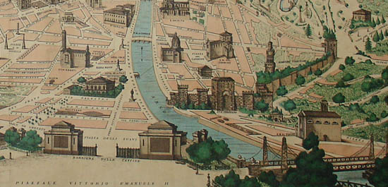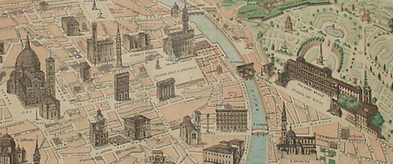 Bird’s-eye view of Florence, Italy, showing important buildings and monuments in raised perspective, along with bridges over the Arno River, and simplified renderings of trees to indicate parks and tree-lined roads. City streets, parks, bridges, buildings and piazzas are labeled. Since Florence, with its rich history of Renaissance architecture, has long been a popular destination for tourists, the map was probably marketed to visitors, especially inasmuch as the company that produced it also published guidebooks.