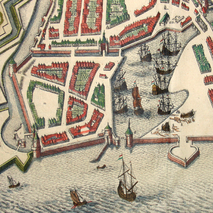 Georg Braun was the editor of Civitates Orbis Terrarum, and Frans Hogenberg the chief engraver. They based their views mostly on existing maps. A large part of their work derived from Theatrum Orbis Terrarum, published in 1570 by the Antwerp cartographer Abraham Ortelius. This work was considered the first modern published atlas. Indeed, Theatrum Orbis Terrarum was in many respects the model for the Civitates, with similarities in titles, as well as the formats, layouts and order of the plates. The accompanying texts were in many cases also based on Ortelius’ work, as Braun indicated in the preface to the first part of the 1572 edition. Braun and Hogenberg also utilized drawings by other artists, notably the Antwerp artist Joris Hoefnagel (1542-1600), who had traveled through most of Western Europe. Jansson acquired the Braun & Hogenberg plates from Abraham Hogenberg (probably Frans’ son).