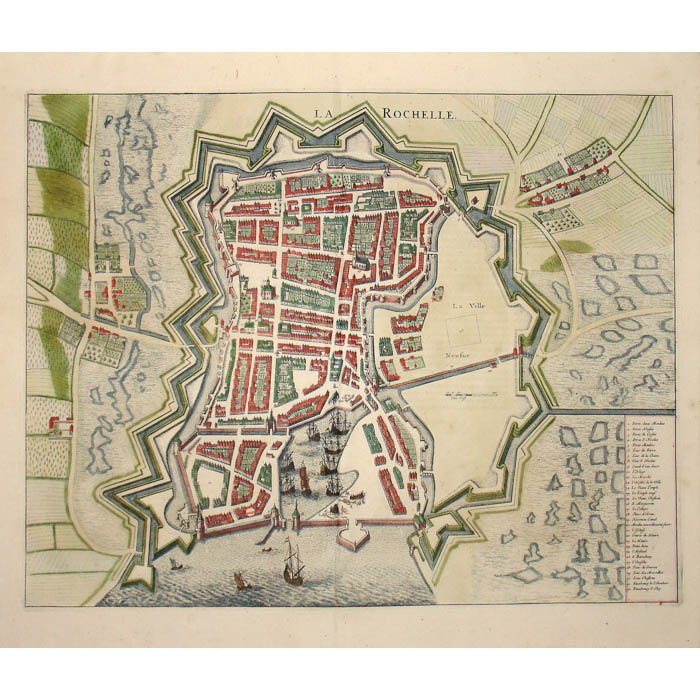 These engravings are from an eight-volume series of “town books” published by Jan Jansson, having views of towns and cities. Townbook Volume V was comprised of views of France and Switzerland. The other volumes included the Low Countries, Germany, Scandinavia, Italy, Greece, Spain and the Far East. Jansson embarked on the project in the early 1650s after acquiring the plates of the seminal town view book by Braun & Hogenberg, Civitates Orbis Terrarum [Towns of the World] (1572-1617), modifying many of the original plates and adding new views.