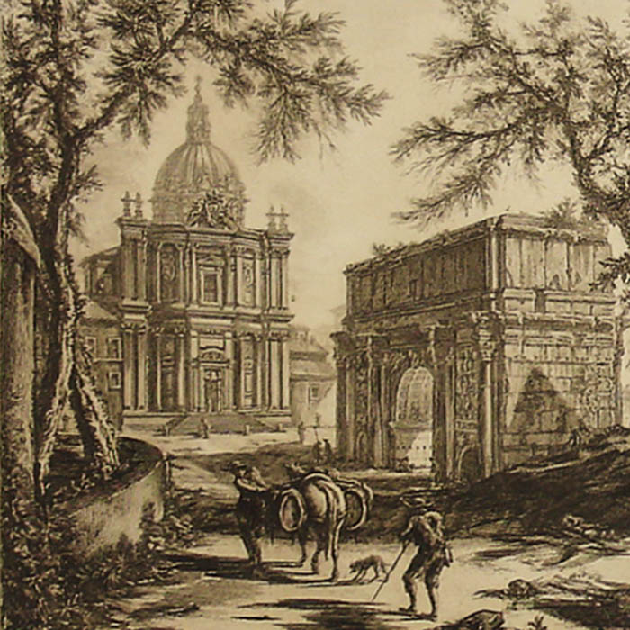 Giovanni Battista Piranesi was one of the leading figures in the development of the neoclassical style in the 18th century. His Vedute di Roma depicted the great buildings of Rome, from ancient times and the Renaissance to the mid 18th century, when many were in ruins. Their lasting popularity is due not only to the picturesque subject matter but Piranesi’s consummate artistry, command of perspective, subtle tonality, and imaginative flair. The Vedute is the largest and best known series of the prints Piranesi produced, comprising 135 plates by him and two by his son Francesco Piranesi (Hind, 5). Piranesi scholar John Wilton-Ely describes the Vedute as follows: