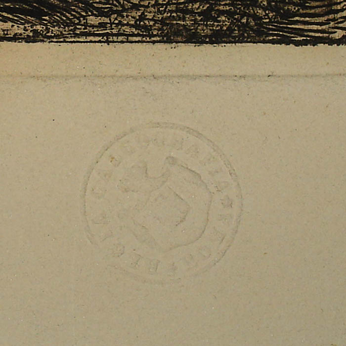 There were several posthumous printings of Piranesi’s views following his death in 1778. His son, Francesco Piranesi, added two final plates to the 135 etched by his father that Francesco and his brother Pietro continued to sell in Rome until 1799. Then they left Rome and set up a business in Paris, publishing the first Paris edition from 1800 to 1807. The so-called intermediate Paris editions were published circa 1807 to 1835. Finally, the Firmin-Didot edition was published in Paris circa 1835 to 1839. Agents for the Vatican purchased the plates in 1839 for the Camera Apostolica, which at the time was the central financial office of the papal administration, and returned them to Rome to be printed by the Calcografia Camerale, a venerable Roman printing press. This printer was renamed the Regia Calcografia in 1870 and operated under that name until 1945 when it became the Calcografia Nationale. Impressions under the imprint of Regia Calcografia from 1870 on generally have an embossed blind stamp with “Regia Calcografia” and central emblem of a crown surmounted by a cross. Piranesi prints published in Rome during the 19th and 20th centuries are sometimes referred to as “Pope’s edition.”