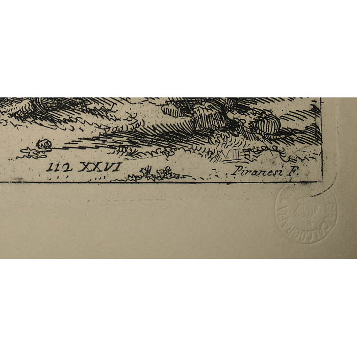 There were several posthumous printings of Piranesi’s views following his death in 1778. His son, Francesco Piranesi, added two final plates to the 135 etched by his father that Francesco and his brother Pietro continued to sell in Rome until 1799. Then they left Rome and set up a business in Paris, publishing the first Paris edition from 1800 to 1807. The so-called intermediate Paris editions were published circa 1807 to 1835. Finally, the Firmin-Didot edition was published in Paris circa 1835 to 1839. Agents for the Vatican purchased the plates in 1839 for the Camera Apostolica, which at the time was the central financial office of the papal administration, and returned them to Rome to be printed by the Calcografia Camerale, a venerable Roman printing press. This printer was renamed the Regia Calcografia in 1870 and operated under that name until 1945 when it became the Calcografia Nationale. Impressions under the imprint of Regia Calcografia from 1870 on generally have an embossed blind stamp with “Regia Calcografia” and central emblem of a crown surmounted by a cross. Piranesi prints published in Rome during the 19th and 20th centuries are sometimes referred to as “Pope’s edition.”