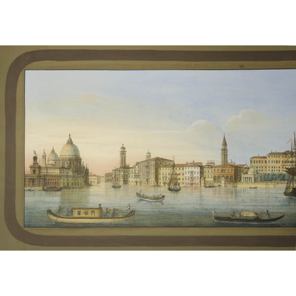 The print is heavily colored in gouache intentionally so that it resembles an original painting more than a print. The margins are entirely painted in goauche as well, with the title in large block red letters The gouache obscures the print’s publication credits making attribution more difficult. Nonetheless, the format and style of the print, including the typography of the title, resembles ones of Milan, Rome and Florence published by Tommaso Genevresi in Milan in the mid 19th century.