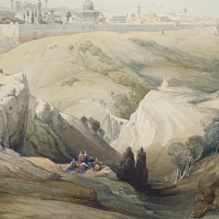 David Roberts was born in Edinburgh, Scotland. He began his career as a house painter and by 1816 was painting stage scenery for the theatre. In 1820 he met Clarkson Stanfield, who encouraged him as an artist, and in 1821 he moved to London, where he worked with Stanfield on sets at the Drury Lane Theatre. Roberts exhibited at the first show held by the Society of British Artists, and was able to become a full-time fine art painter in 1830. During the early 1830s he began to produce the sketches of foreign lands that were to make him famous, beginning with Spain. In 1838 and 1839 he undertook an extensive and adventurous journey to Alexandria, Cairo, and other places in the Middle East, making extensive sketches. He recorded broad vistas of the ancient world with local inhabitants, as well as detailed studies of classical architectural ruins. In the 1840s, over a period of seven years, lithographs of his sketches of the Middle East, together with text, were published in 41 parts in The Holy Land, Syria, Idumea, Arabia, Egypt and Nubia. According to J.R. Abbey, this work forms “one of the most important and elaborate ventures in nineteenth-century publishing, and … the apotheosis of the tinted lithograph.” Roberts also produced an illustrated work on Italy in the 1850s. His paintings are in many museum collections, including the Victoria and Albert Museum, London.