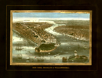 View of New York City, delineating buildings, docks and the bustling river traffic of ships and boats. Shows Governors Island in the foreground. Issued prior to the construction of the Brooklyn Bridge. Made with an unusual process, the hand colored engraving was varnished and printed with Federal style black margins with gold borders and letters.
