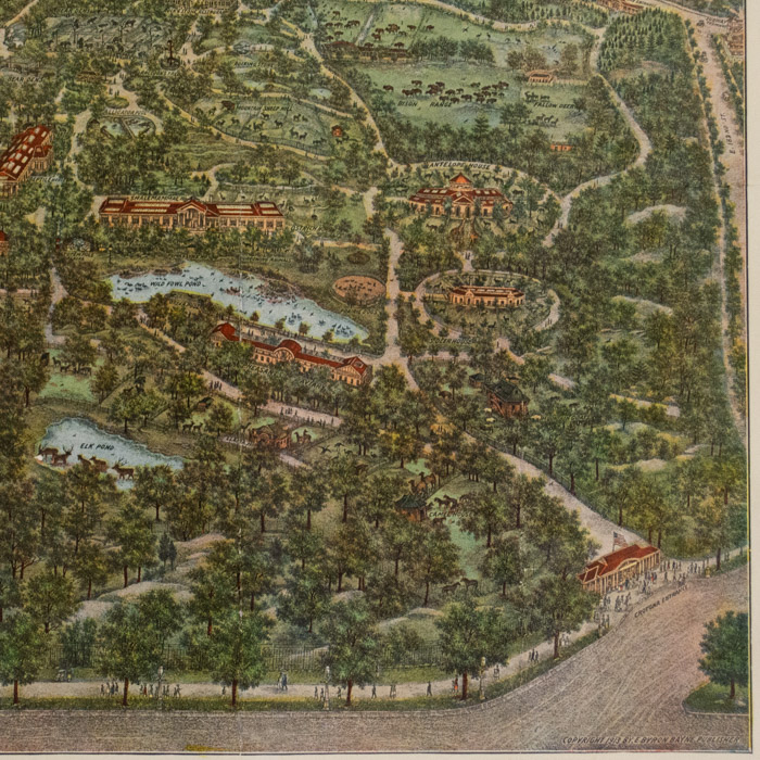 A colorful and highly detailed bird’s-eye view map of the Bronx Zoo, then known as the New York Zoological Park. The zoo’s buildings, paths, and ponds are included and labeled. Animals are also visible in the outdoor enclosures: ducks in the ponds, birds in the Flying Cage, sea lions in their outdoor pool, and elephants, rhinos, deer, elk, foxes, wolves, bears, sheep, alligators, camels, and bison, among others. Information to help visitors navigate the large, wooded grounds includes the entrance pavilions, the subway terminal, and facilities such as restrooms, restaurants, administrative buildings and the boat house. Pedestrians are shown walking on the paths. The panoramic view stretches into the distance showing some of the surrounding roads and houses in the Bronx.