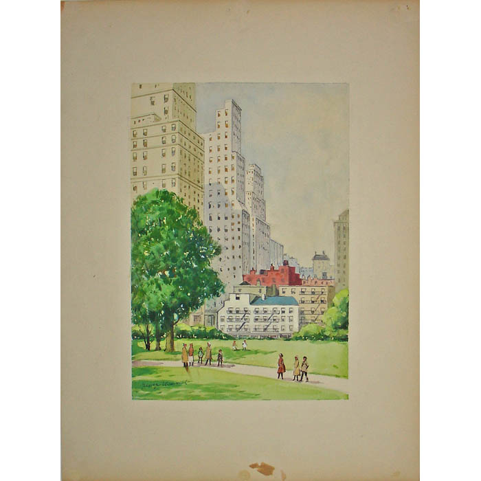 Sunlit view of the green lawn and leafy trees of Central Park with pedestrians on the paths and buildings rising in the distance, from a series of paintings of New York City scenes by George Stimmel. It appears to depict the portion of the park near 59th Street.